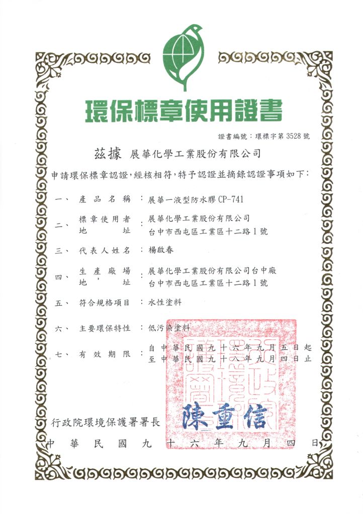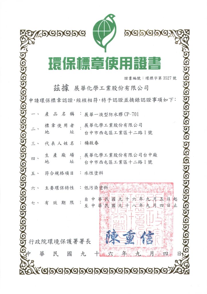 一液型防水膠環保標章證書 一液型防水膠環保標章證書
